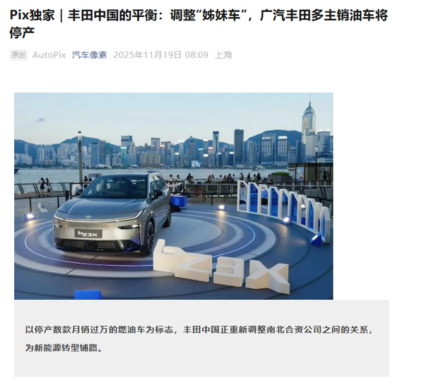 【CNMO科技消息】据汽车像素报道,为推进电动化战略,广汽丰田计划于2026年停产两款主力燃油车型,包括一款月销过万的中型SUV和一款紧凑级轿车。此举标志着丰田中国正系统性调整南北合资公司——广汽丰田与一汽丰田之间的产品布局,逐步淡化沿用二十余年的“姊妹车”策略。该策略曾助力丰田快速抢占市场,但在当前激烈竞争环境下,易引发内部价格战,压缩利润空间。
